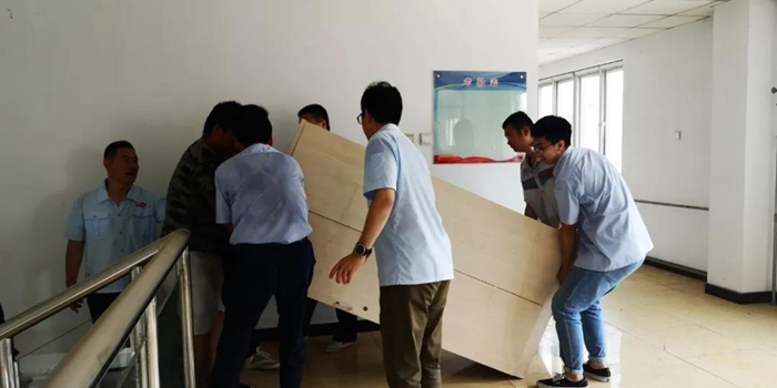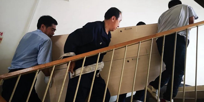 當(dāng)日天氣十分潮濕悶熱,不動(dòng)都是一身汗,但是黨員同志們?cè)谥苡癖蟮膸ьI(lǐng)下,一件一件搬動(dòng)近兩米的衣柜,一步一步搬運(yùn)至宿舍樓四樓。經(jīng)過(guò)大家的共同努力,終于將幾組衣柜搬運(yùn)到了新員工宿舍,并細(xì)致地更換了柜鎖。