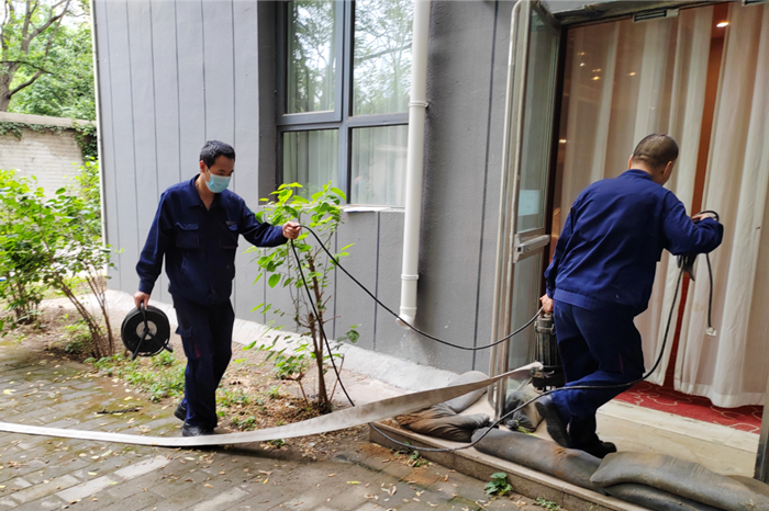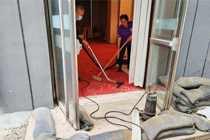接到指令的工程部人員攜帶搶險排澇設(shè)備:潛水泵、防水線軸、排水水帶趕到現(xiàn)場,迅速開展排澇搶險工作;接到搶險指令的客房部人員攜帶吸水機、舊布草、拖把隨即到達現(xiàn)場,對室內(nèi)殘存的積水進行了處理。最終,在參與搶險的各部門人員的通力合作下,“內(nèi)澇險情”得到了有效控制,保護了酒店財產(chǎn)不受損失。此次演練圓滿成功,達到了預(yù)期效果。