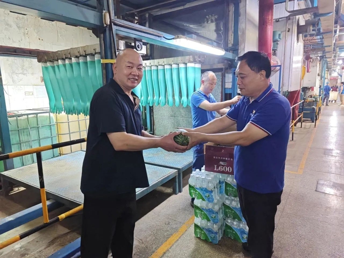 就在“職工之家”開放之際,一份清涼也送到了職工手中。近日,華騰橡塑領(lǐng)導(dǎo)專程來到瑞京公司生產(chǎn)一線,向在酷暑中仍然奮戰(zhàn)在一線的干部職工送上清涼飲品和爽口西瓜,并對大家表示慰問,叮囑大家要做好防暑降溫工作。
