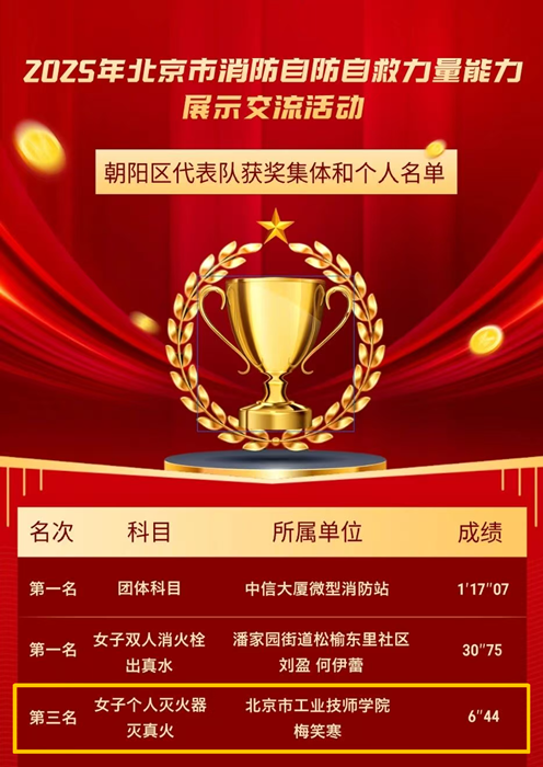 11月上旬,技師學院教師梅笑寒代表朝陽區(qū)參加北京市2025年消防自防自救力量能力展示交流活動,在“女子個人滅火器滅真火”項目中榮獲北京市第三名。此次交流活動,來自全市20支代表隊、600名消防安全重點單位、社區(qū)(村)自防自救力量隊員同場競技。
