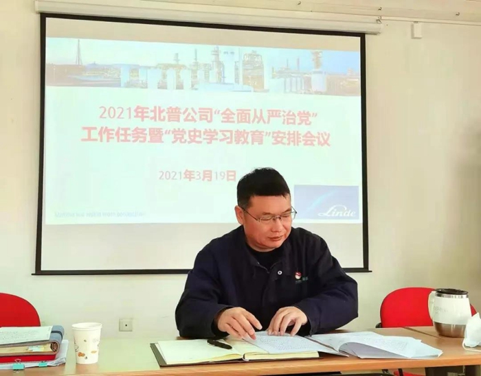 3月19日,北普公司黨委召開黨史學習教育動員部署大會,黨委書記吳時林作動員講話。黨委領導班子成員、各基層黨支部支委會全體成員參加會議。
