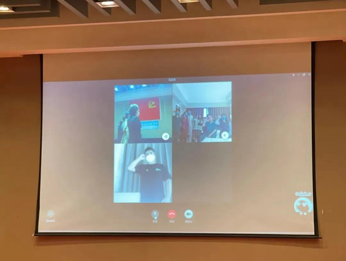 距嘉賓樓不遠(yuǎn)的另一座樓內(nèi),一部分同樣表情肅穆、胸戴黨徽、身穿防護服的同志們同一時間舉起右手,莊嚴(yán)宣誓。