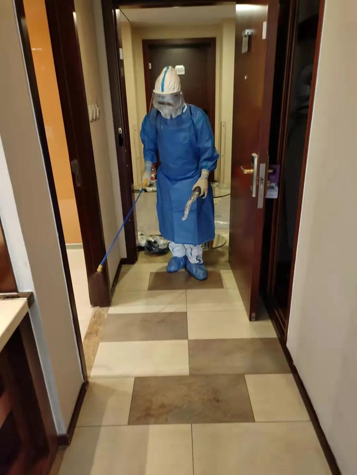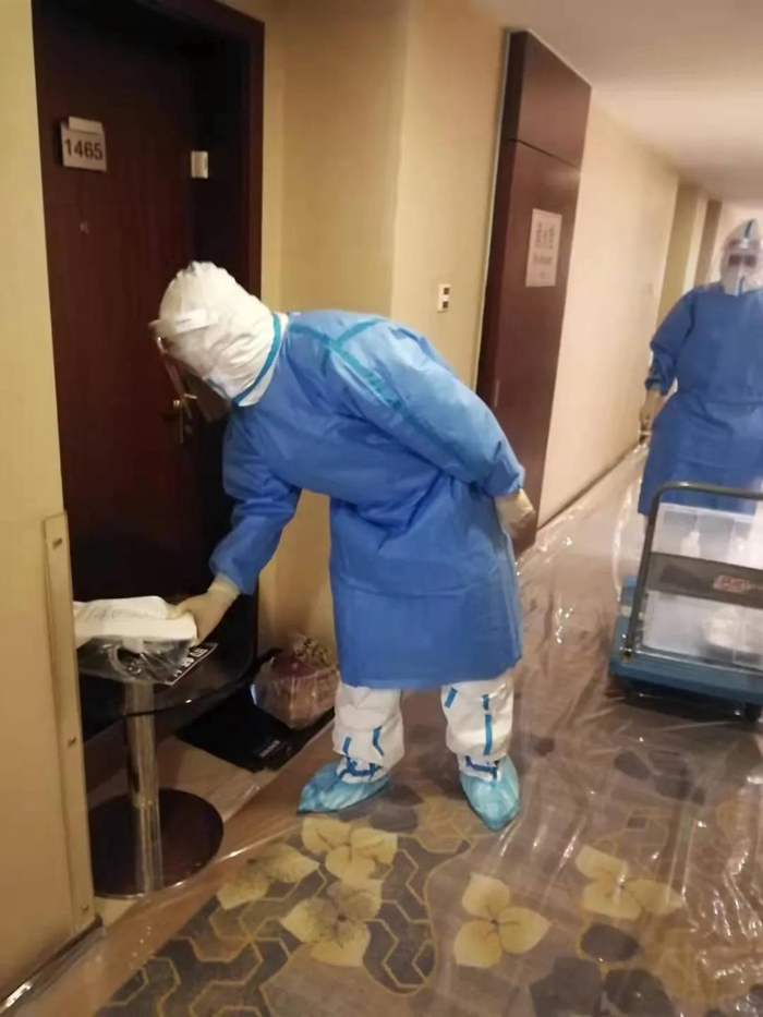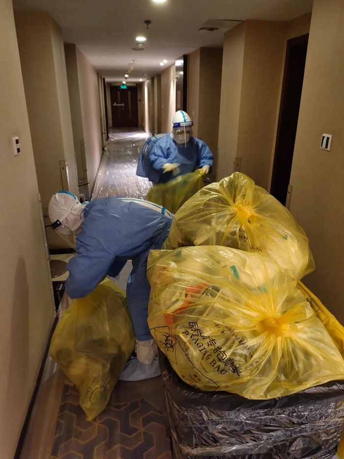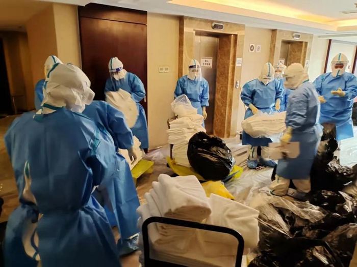 困難和挑戰(zhàn)首先體現(xiàn)在前臺入住、離店手續(xù)、客房清潔的工作流程的較大變化上。前臺每次接到指揮部通知即將有新隔離人員入住或隔離人員解除隔離時,他們都需要全副武裝穿上防護服在前臺等候。每天都有隔離人員解除隔離,離開酒店后,消殺組會對客房、公共區(qū)域進(jìn)行全面消毒??头糠?wù)組在隔離人員退房后,對所有隔離人員使用的物品嚴(yán)格按照感染性廢物進(jìn)行處理,處理完畢后重新打掃恢復(fù)房間使用,這對于從未從事過醫(yī)療行業(yè)的員工來講,是一種全新挑戰(zhàn),在接受了醫(yī)護人員的緊急培訓(xùn)后,他們嚴(yán)格履行操作流程,對100多個房間進(jìn)行了打掃翻房處理,保證了后續(xù)隔離觀察人員的順利入住。