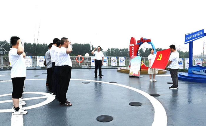 在“洪澤湖號(hào)補(bǔ)給艦”甲板層,全體黨員和入黨積極分子舉起右拳,面向黨旗莊嚴(yán)宣誓,誓為黨的事業(yè)奮斗終身。
