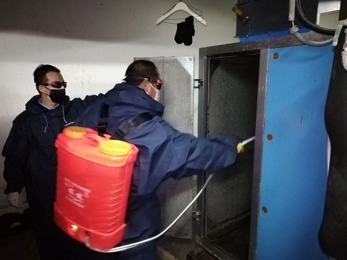 在大廈大堂,公司黨總支書記、總經(jīng)理、副總經(jīng)理、運(yùn)營總監(jiān)現(xiàn)場(chǎng)協(xié)調(diào)指導(dǎo),及時(shí)與公司辦公室溝通物資供應(yīng),事業(yè)部班子成員現(xiàn)場(chǎng)指揮調(diào)度,中控操作、樓內(nèi)保潔消毒、空調(diào)消毒、客戶服務(wù)等各方面工作緊張有序推進(jìn)。