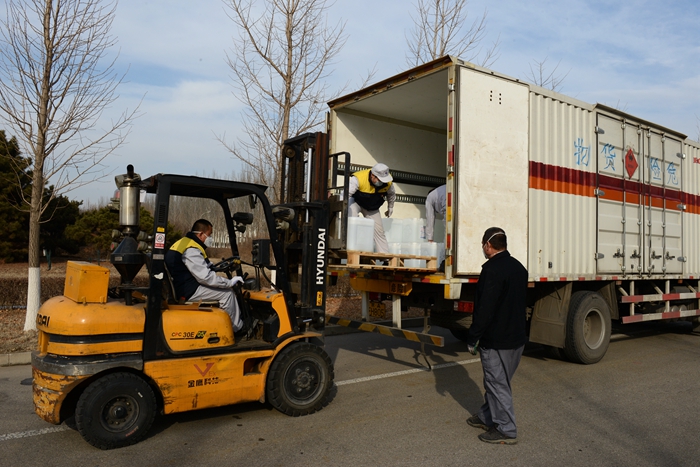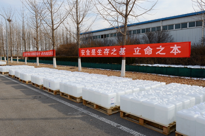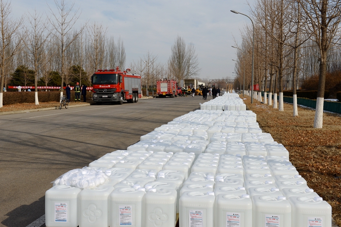 根據(jù)用戶反饋的需求信息,經(jīng)市物資保障組決定,將25L大包裝調(diào)整為500ML/瓶小包裝,北化集團承擔相關(guān)卸貨、進庫、儲存、配送任務(wù)。由華騰化工公司倉儲事業(yè)部、安全生產(chǎn)部、保衛(wèi)部、公用工程事業(yè)部20名同志負責(zé)卸貨入庫。