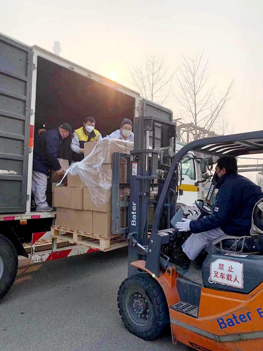 2月14日,全市普降大雪,當天又新運到5000箱500ml裝消毒酒精,華騰化工的職工們?nèi)吮Ъ缈?、冒雪完成了卸車任?wù)。