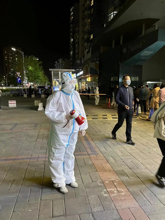 華騰丹陛華業(yè)務骨干劉純在潘家園街道潘家園東里社區(qū)參加核酸檢測現(xiàn)場秩序維護或信息錄入工作。